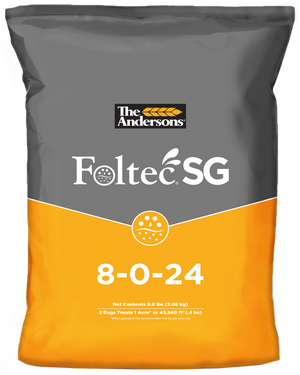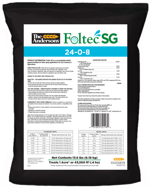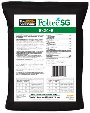 Foltec SG is packaged based on application rate and coverage. A single 13.6-lb. bag of the 24-0-8, 8-0-24, 8-24-8, and 16-0-16 products will cover one acre at the typical application rate, while a single 2.25-lb. bag of the Minors product will cover one acre at the typical application rate.